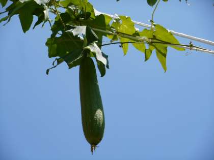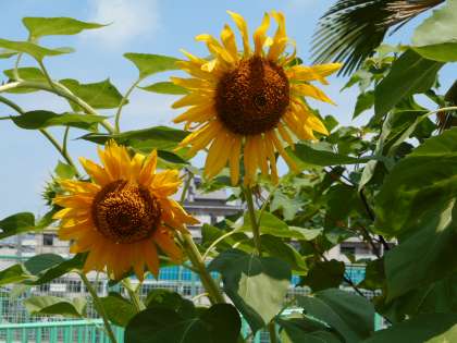 8月10日(金)、連日猛暑日が続いています。子どもたちが登校していない学校は閑散としています。中庭のヒマワリは太陽に向かって元気に咲いています。学習園では、4年生が栽培しているヘチマが青空のもとぶらりと垂れさがっています。