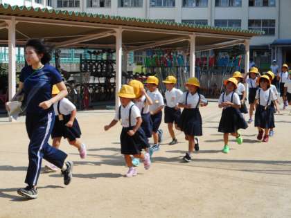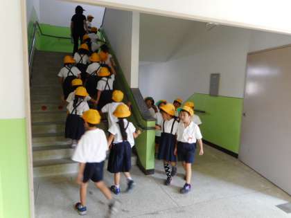8月29日(火)5限、蒸し暑い中ですが「避難訓練」を行いました。昨年度までは「大阪880万人訓練」の日(9月5日)に実施していましたが、2学期の開始時期が早くなり運動会の練習との兼ね合いもあり本日に。