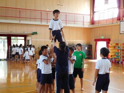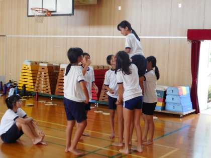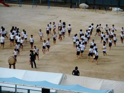 9月13日(水)5.6限、5.6年生の合同練習の時間。本番までの練習日数が残り少なくなってきました。団体演技は「組体操」と「演舞」の2部構成。6年生は昨年経験しているので少し余裕が。5年生が組体操の練習中に、団体競技「騎馬戦」の騎馬の組む相手の相談や組み方の練習をしていました。最後は、講堂を出て運動場で「演舞」の練習に取り組みました。一日一日の練習の積み重ねが、自信と演技の向上につながっています。
