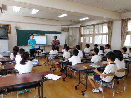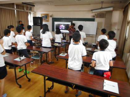 9月15日(金)、2学期より新しくC-NET(大阪市外国人英語指導員)が来られました。2限、6年1組の外国語活動の時間。自己紹介を兼ねて、出身国の自然・料理・音楽などを紹介。音楽を聴きながら簡単なダンスを踊り、楽しみました。本校では、10月より全学年外国語活動がスタートします。