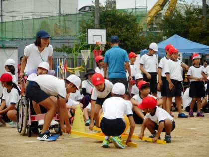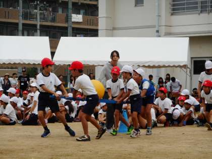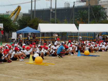 9月24日(日)、たてわり班対抗競技は「うりひがパワー!! みんなの力!!」。木曜日の朝、児童集会で1年生〜6年生のたてわり班でクイズやマスゲームなどに取り組んでいます。今日の運動会では「ボール運び」で団結力をアピールできました。