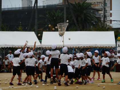 9月24日(日)、1年生の団体競技は「たまいれ UFO」。「UFO」の曲が流れている間はダンスを踊ります。曲がストップしたら、玉入れのスタート。ダンス、玉入れ。ダンス、玉入れの繰り返しです。結果は、98対118で紅組の勝利となりました。