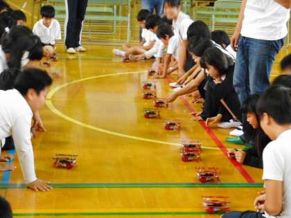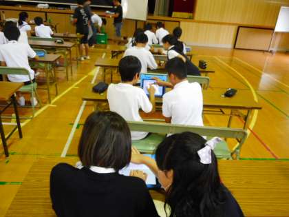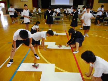 10月2日(月)3.4限、企業の方に来校いただき、講堂で「プログラミング教育」の出前授業を行いました。内容は、車(ロボット)に指示を出し課題をクリアできるようにする。最終課題は「決められたコースの上を、出発し到着する」です。児童たちは、思い通りに走る車にするために調整を繰り返します。コンピュータに指示を出す作業を体験し、論理的思考力を身につける「勉強しながら楽しむ」授業となりました。
