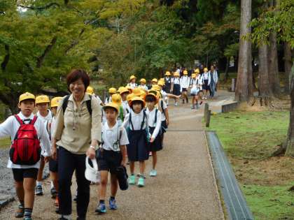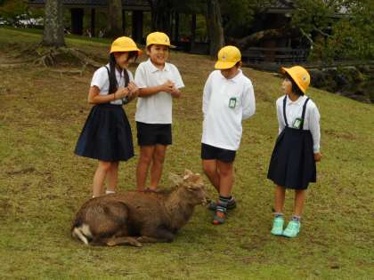 10月12日(木)、どんよりとした曇り空の朝。5年生が「奈良公園」に向けて出発。東大寺に向かう途中、小雨に降られましたが、雨はこの時だけ。若草山のふもとにある大きな芝生広場でお弁当と休憩タイム。その後は、二月堂を見学して帰校しました。