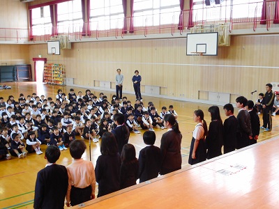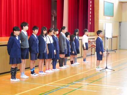 10月19日(木)朝、この時期にしては冷え込む朝となりました。講堂では「児童集会」が開かれています。今日は、後期代表委員の12名が、立候補した理由と決意を発表しました。「5.6年生の代表委員の頑張りにあこがれて」「みんなの役に立ちたい」「あいさつ運動を頑張り、あいさつできる人を増やしたい」「みんなの見本になれるように頑張ります」などなど。瓜破東小学校の代表=「顔」としての活躍を期待します。