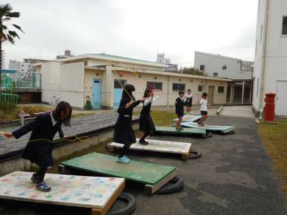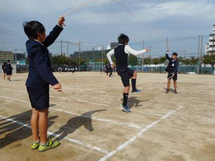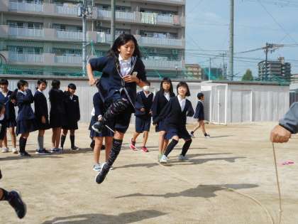 10月24日(火)、登校後すぐ、中庭のジャンピングボートを利用してなわとびの練習をしています【写真左】。昨日23日から11月17日の4週間は、体力づくりの取り組みとして「なわとび週間」としています。各学年ごとに取り組む目標を決め、20分休憩・体育の授業を利用し練習します。期間終了後には「なわとび大会」を行い練習の成果を交流する予定です。