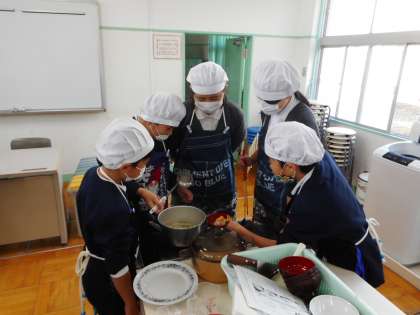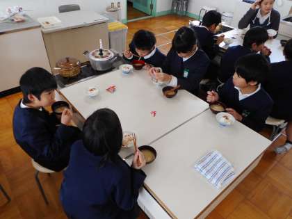 12月15日(金)3.4限、5年1組家庭科(調理実習)の授業。田植え・稲刈り体験で収穫したお米を使いご飯炊きとみそ汁づくり。みそ汁は煮干しで出汁をとります。具はあげと大根。お米は半透明のお鍋に入れ、焚きながらお米の様子を観察します。子どもたちからは「おいしい」と言う声が聞こえてきます。どの班も協力して取り組めていました。