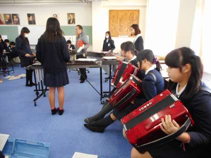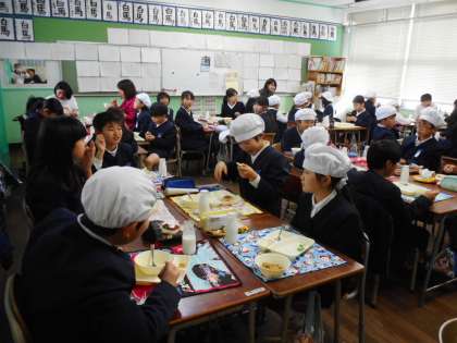 12月21日(木)、3限、1年2組国語科の授業。図書館での読書タイム。学校図書館支援員の先生の読み聞かせに、児童たちは熱心に聞き入っていました。音楽室では、6年生全員が楽器演奏の練習中。3学期にある発表会の準備だそうです。授業終了後は、給食の時間。4年1組では、班単位で友だちとおしゃべりしながら楽しいそうにいただいていました。