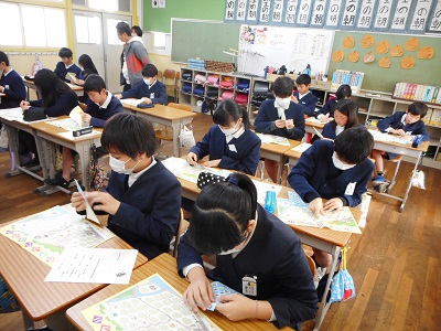 1月31日(水)、市税事務所や企業から講師をお招きし「出前授業」を行いました。1〜3年生はプログラミング学習の3回目。ロボットがパン屋さんの店員として、おすすめのパンを紹介するチャートや命令などを考えました。6年生は「租税教室」と銘打ち「税の種類、どのように使われているのか、もし、税金がなければどうなるのか?」などを学習しました。