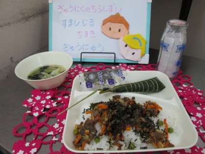 今日の給食は、こどもの日の行事献立で、「牛肉のちらしずし、すまし汁、ちまき、牛乳」でした。