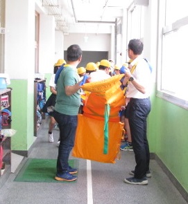 非常ベルの後、各学級から先生の指示で避難します。煙を吸わないようにハンカチを用意。車椅子が使えないときのことを想定し、簡易担架を使用した避難も試みました。