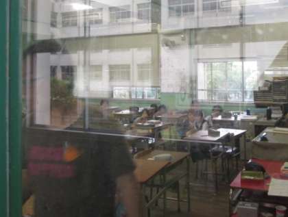 ↓ 侵入者に対応するよう暗号による校内放送が流れ、教室では、扉を中から施錠し、子どもたちは侵入者から見えにくいように、離れたところにしゃがみ込みます。