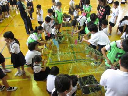 その後、いよいよ願いを込めた短冊を飾ります。本校には、裏庭に立派な竹が生えていて、昨日までに、管理作業員さんがそれを切って準備してくれました。今日は、その竹に短冊を飾りました。