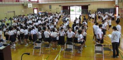 子どもたちは、まず地域子ども会の班で並びます。次に7つの防災ブロックに並び替え。初めての試みです。