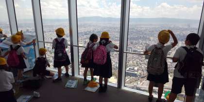 再び環状線に乗って、天王寺駅で下車しました。それから、あべのハルカスの展望台にのぼりました。地上300mから見下ろす大阪のまちは、まるで小さなおもちゃの世界でした。