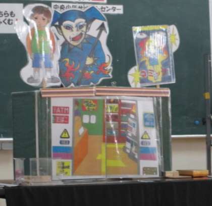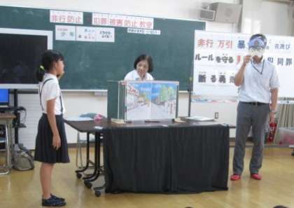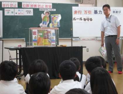 5年生は、「非行」とはどんな行いか、万引きしたらどうなるか、といった具体的な例を、ペープサート(人形劇)で教えていただきました。また、「声かけ被害」に合わないための防止方策として、警察への電話体験もさせていただきました。