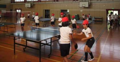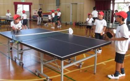 台上でピン球を打ち合ったり、試合形式で練習したりしています。