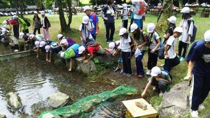 途中の池では、落ちそうになりながらも、高原の湧き水を手ですくっている子どももいました。