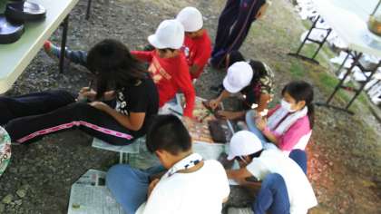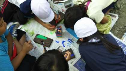 黒々とした木の板に、思い思いの絵や言葉をかいていきます。
