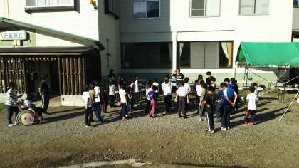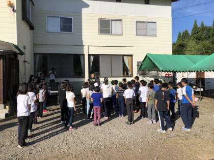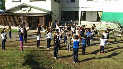 子どもたちが眠い目をこすりながら、宿舎前広場に集まってきました。