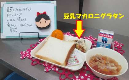 今日の給食献立は「豆乳マカロニグラタン、トマトスープ、冷凍みかん、牛乳」です。グラタンに使用されているマカロニもグラタンのルウも、米粉を原材料としています。