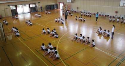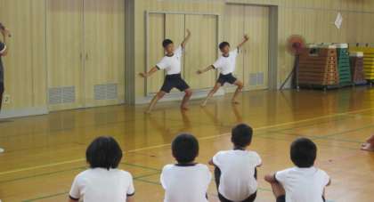 5・6年生の足元をご覧ください。裸足です。個人の動きも隊形も、相当難しくなります。高学年では、手本の動きを6年生が行うこともあります。さすが最高学年!