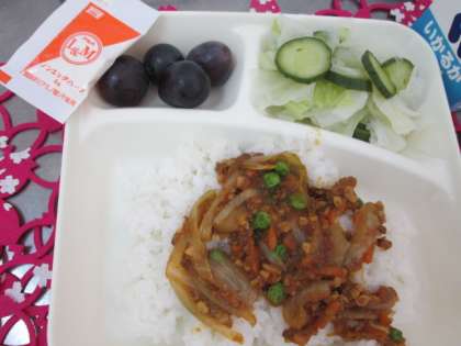 今日の献立は「大豆入りキーマカレー、グリーンサラダ、ぶどう(巨峰)、牛乳」。キーマカレーのルウの素は米粉を原材料とし、小麦粉を使用していません。サラダに添えているドレッシングはマヨネーズ風味ですが、卵を使用していません。