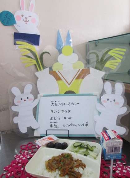 給食調理員さん手作りのポップな飾りで、献立見本を彩ってくださっています。