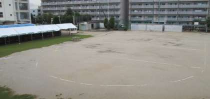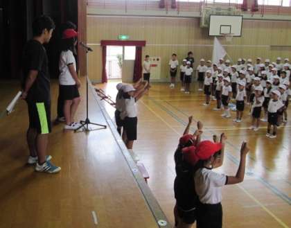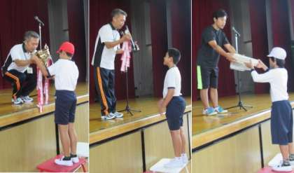 昨日からの雨で、今日も運動場は使えません。1時限目、体育館で全体練習を行いました。今日は閉会式の練習です。得点発表、優勝カップ・準優勝盾の授与、記念品授与、みんな緊張しています。