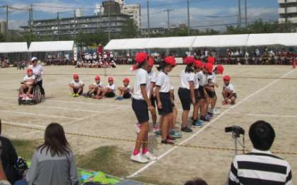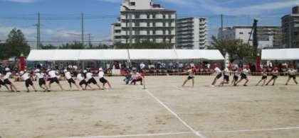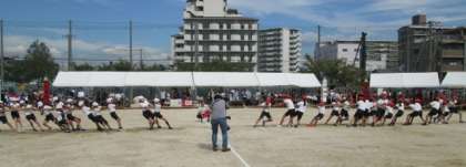 5年生団体競技です。1・2回戦は女子と男子に分かれて実施。それぞれスタートラインから走っていき、綱を引き合います。3回戦は全員です。互いに譲らない、なかなかの名勝負でした!