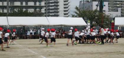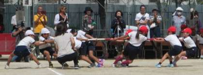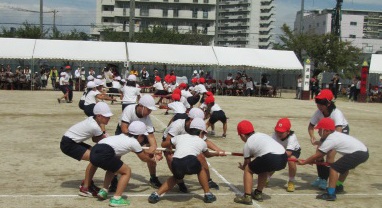 3年生の団体競技。趣向を変えて3回行いました。3回戦は、自分たちの勝負がついたら、同じチームの手助けにいくことができます。最後は1本の棒にたくさんの子どもたちが…。見ていてハラハラドキドキしました。