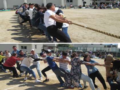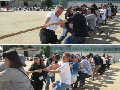 PTA会長の十河様からごあいさつをいただきました。その後、綱引きに。校長先生チームvs教頭先生チームで、全員本気モード。子どもたちの声援に後押しされ、先生も保護者の皆さんも、力を出し切りました!