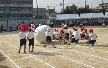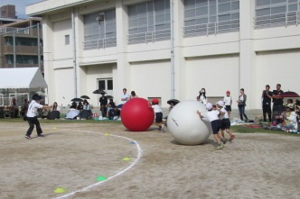 2年生の団体競技。事前に「保護者席に突っ込む…」と可能性を知らされていたので、途中コースアウトしかけた時も、保護者の方がそっと手助けを!真剣ながらも楽しいレースでした!!