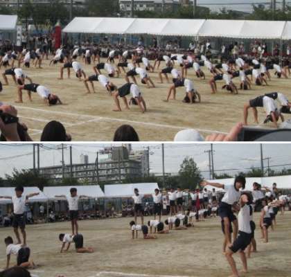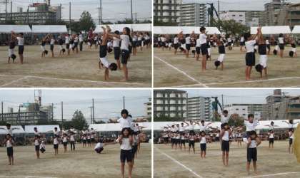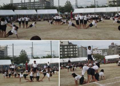 5・6年生の団体演技、前半の組体操です。子どもたちの力と汗が輝き、大きな掛け声が響き渡りました!文字通り「一致団結」!!