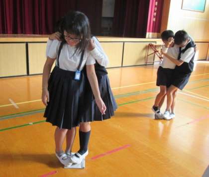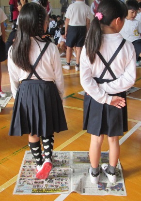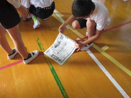 たてわり班の中でペアを作って、広げた新聞紙から協力して落ちないようにするゲームです。集会委員とじゃんけんをして負けると、乗っている新聞を半分に折りたたみます。どんどん小さくなって落ちたら残念。落ちないように、お互い引っぱり合ったり、抱き合ったり、試行錯誤して小さくなった新聞の上でふんばっていました。