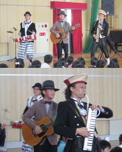 オープニングから鍵盤ハーモニカやギター、パーカッションを用いて、様々な曲や演奏方法を披露してくれました。また、楽器演奏の裏技まで教えてもらいました。