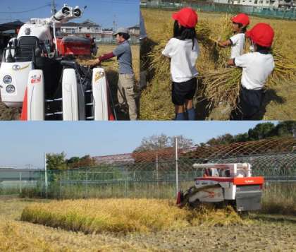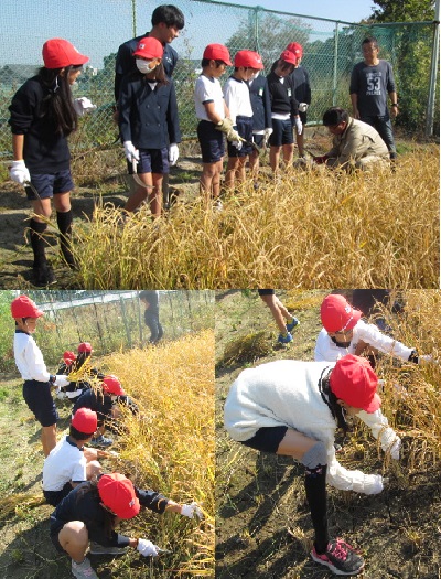 秋晴れの本日、5年生は大阪市JA営農センター 区民わた畑に行き、稲刈り体験をさせていただきました。