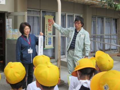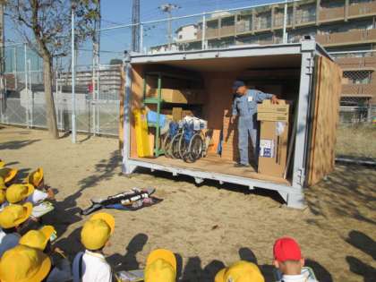防災倉庫の中には水、食糧、毛布、トイレ、工具など様々なものが入っていて、子どもたちは大変驚いていました。