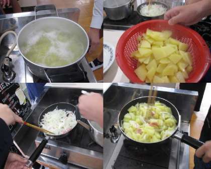 衛生面を考え、全ての道具等をしっかり洗います。その後、洗い物を拭いたり材料を切ったり、手分けして行います。じゃがいもを下ゆでし、玉ねぎとベーコンを炒め、合わせます。
