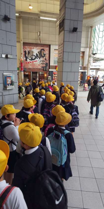 昼食後は、「天神橋筋商店街」を見学しました。スーパーマーケットやコンビニエンスストアとは違う商店の形です。子どもたちは、ついついお店の方に気持ちがいってしまいます。「いつまで続くの?」という声があがるほど、長く続く商店街でした。