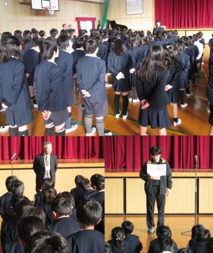 始業式の最初、校歌斉唱の際には美しい歌声が、講堂に響きました。その後、校長先生から「1月は行く、2月は逃げる、3月は去るといって、3学期はとても早く過ぎていく。しっかりとMark【目標】をもって、何事にもChallenge【挑戦】しましょう!」と、吉田先生から「しっかりとあいさつをすること、1月の生活目標『進んで体力づくりをしよう』について、マラソン大会もあるので、しっかり体を動かそう!」と、話がありました。