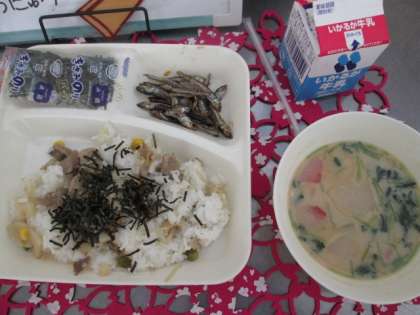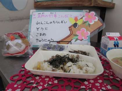 今日から給食開始です。正月の行事献立「れんこんのちらしずし、ぞう煮、ごまめ、牛乳」です。ごまめは、カタクチイワシの幼魚を干したもののことです。昔、カタクチイワシを肥料として田にまくと、米がたくさんとれたことから、豊作を願う意味がこめられています。