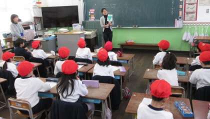 今日も、長吉小学校栄養教諭の櫻井先生が1年1組(2組は学級休業中)に授業をしてくださいました。