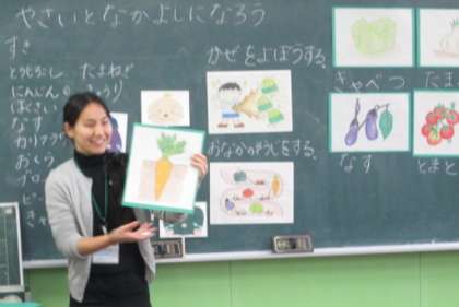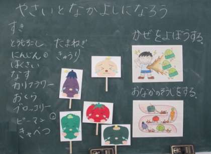 私たちにとって大切な「やさい」。「すきなやさいは?」「にがてなのは?」子どもによって答えはまちまちでした。「やさいのはたらきは…」等、学習しました。