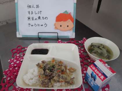 昨日の献立は「他人丼、すまし汁、黒豆の煮もの、牛乳」でした。