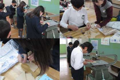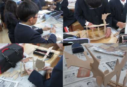 1枚の板をどのような形に切り出すかを考えて線を引き、電動糸のこぎりで切り分けていきます。持つ手の位置等、安全面には気をつけています。