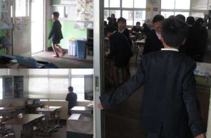 今日の当番の人が職員室から放送します。「教室の窓を開けましょう!」その後、手分けして各教室へ。人がいない時には「失礼します」と入り、窓を開けて回ります。別の人は学習室も開けてくれていました。教室に人がいる時には、「窓を開けましょう!」と声をかけていました。