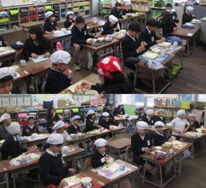 1・2組それぞれの半分が4階の6年生の教室へ、6年生の半分が1年1・2組へ。横に座ったり向かい合ったりして、楽しく食べました。