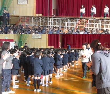 続いて、図書ボランティアさんへのお礼集会を行いました。皆の拍手で壇上にあがってもらい、図書委員会から、挨拶と手作りのプレゼントを渡し、児童全員でお礼を言いました。最後も皆の拍手で見送りました。