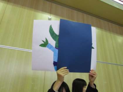 初めに、集会委員が考えたゲーム「半分は何だろう?」で楽しみました。半分隠された絵を見て何かを考えるゲームで、大いに盛り上がりました。